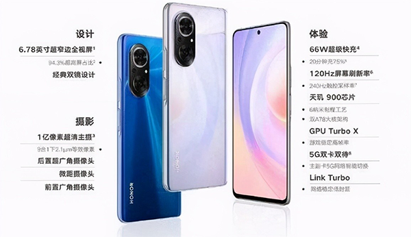 榮耀50 SE采用6.78英寸全面屏,中心挖孔,超窄邊框1.1mm,屏幕比例94.3%,刷新率120Hz,觸控采樣率240Hz,亮黑,魅海藍(lán),流光幻境三種顏色。