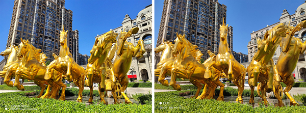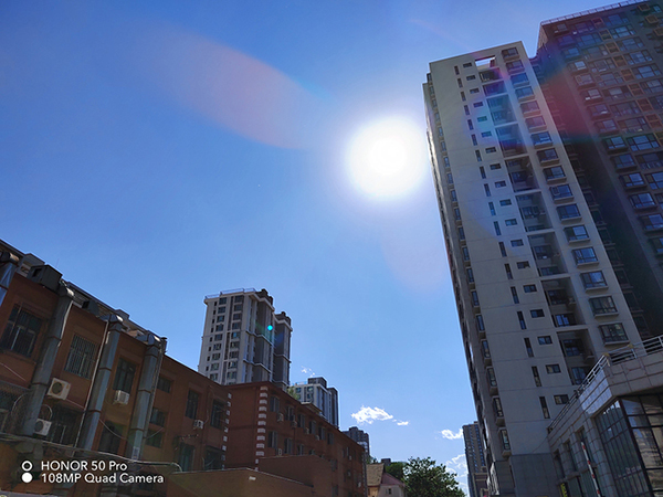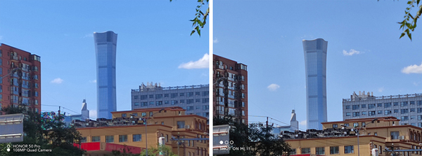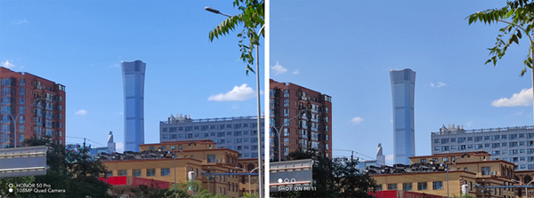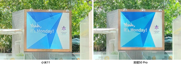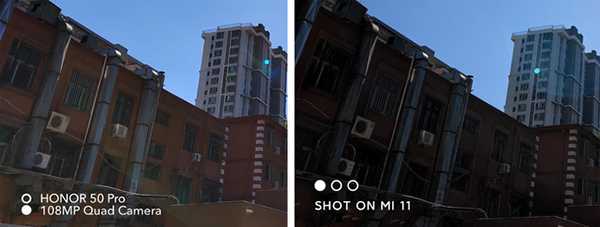 而在陽(yáng)光猛烈的下午逆光場(chǎng)景,兩者總體表現(xiàn)都不錯(cuò),但是榮耀50 Pro整體動(dòng)態(tài)范圍比小米11更好一些,以上圖為例,在均開(kāi)啟HDR情況下,榮耀50 Pro畫(huà)面整體更加明亮,不僅將左下角樓房的紅色很好的展現(xiàn)了出來(lái),而且細(xì)節(jié)保留的也更好;小米11左下角樓房由于畫(huà)面過(guò)暗已經(jīng)成了深紅色設(shè)置快變成黑色,細(xì)節(jié)表現(xiàn)和解析力稍差一些。