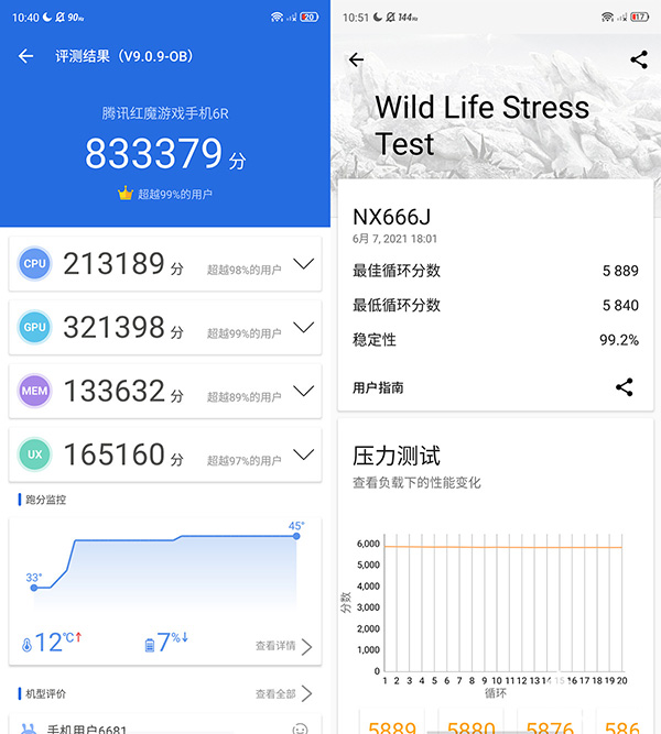 為了直觀地展現(xiàn)紅魔6R的游戲性能,我們讓其運(yùn)行安兔兔和3Dmark。結(jié)果如上圖所述,紅魔6R的安兔兔跑分達(dá)到了83W+,3Dmark的Wild Life Stress場(chǎng)景穩(wěn)定性為99%。從單純的測(cè)試圖來看,紅魔6R的豪華配置確實(shí)“毫無保留”。