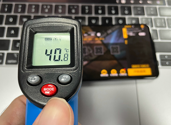 玩了15分鐘后,測溫儀顯示,此時的機(jī)身表面溫度為40.8℃。
