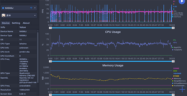 最后是目前手游的天花板《原神》,進(jìn)入游戲后默認(rèn)中特效,為了進(jìn)一步壓榨騰訊紅魔游戲手機(jī)6R的性能,小雷手動將游戲幀率設(shè)置為60幀,實際測試結(jié)果令人意外。