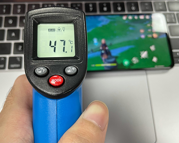 雖然使用騰訊紅魔游戲手機(jī)6R玩《原神》,畫面幀數(shù)基本可以穩(wěn)定在55 FPS以上,但是卻無法壓制這款游戲帶來的發(fā)熱量,因為此時的機(jī)身表面溫度已經(jīng)達(dá)到了47.1℃。
