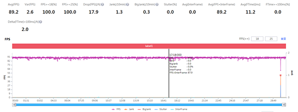 在對(duì)配置要求更高的《和平精英》中,默認(rèn)支持90fps高幀率模式(這也是和騰訊合作的好處之一),在半小時(shí)的游戲中,實(shí)際測(cè)試平均幀率89.2fps,并且一直保持高幀率穩(wěn)定運(yùn)行, 幀率曲線也很平穩(wěn),偶有波動(dòng)(其實(shí)也就3幀左右)也可以在一瞬間恢復(fù),游戲中是沒有任何感知的。