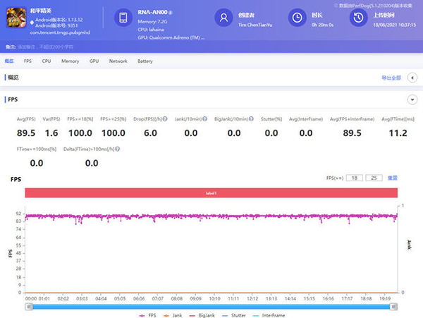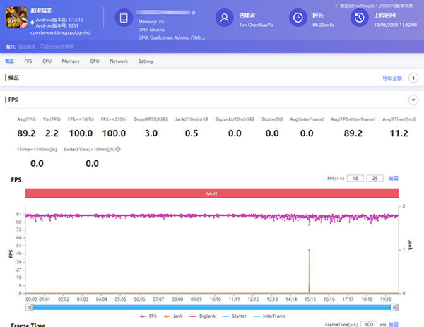 再看看高通驍龍888手機的表現(xiàn),可以看到20分鐘游戲平均幀數(shù)是89.2幀,但是中途出現(xiàn)了一次的卡頓,并且再12分鐘之后出現(xiàn)了幀數(shù)跳動頻繁的現(xiàn)象。