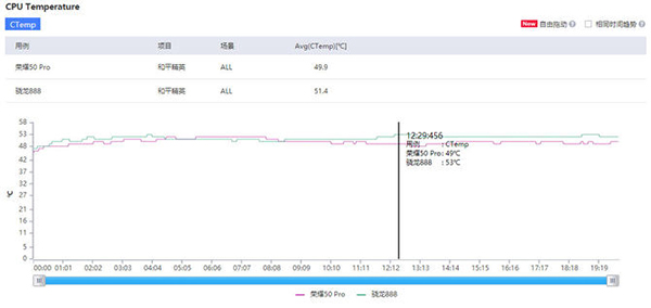 我們再來看一下溫度曲線,可以看到兩臺手機在游戲開始的是否溫度在47°C左右,但是隨著游戲的進行,手機的熱量開始累積,到了12分鐘左右的時候,高通驍龍888手機溫度已經(jīng)高達53°C,而榮耀50 Pro游戲過程的溫度可以保持在50度左右,沒有出現(xiàn)較大的變化。