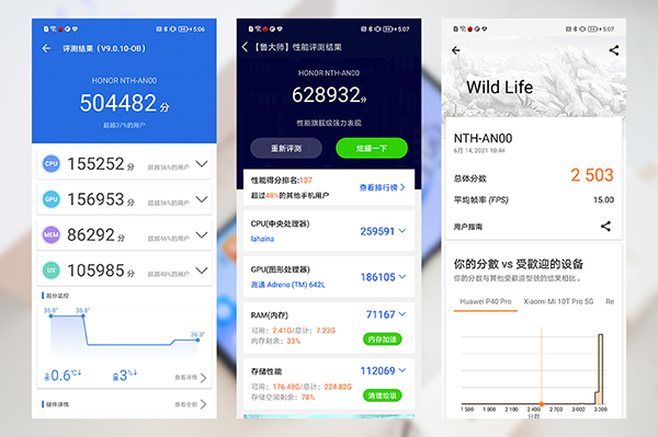 先來看下跑分表現(xiàn),安兔兔取得了50萬的得分,魯大師取得了62萬多分的成績,而3D Mark Wild Life則取得了2503分的成績。