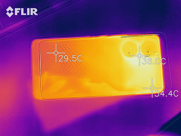 榮耀此次的散熱表現(xiàn),也可以說是相當優(yōu)異的,經(jīng)過20分鐘《原神》游戲后,我們測試了手機背面的溫度,可以看到,影像模組部分溫度是最高的,但也僅僅在36℃,并不會感到燙傷,手機其他部位,溫度則更低。而之所以有這樣優(yōu)異的成績,得益于榮耀50所采用的VC液冷散熱+高導熱石墨烯立體散熱所帶來的出色表現(xiàn)。
