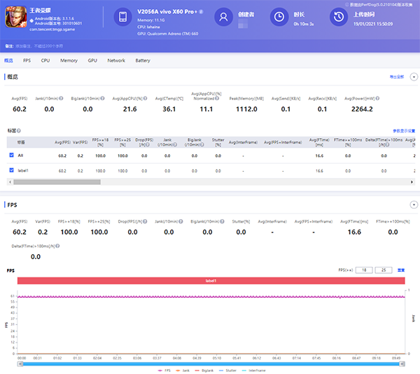 在《王者榮耀》中,即便開啟最高畫質(zhì)和幀數(shù)上限,vivo X60 Pro+的幀數(shù)依舊保持穩(wěn)定,在團(tuán)戰(zhàn)中釋放技能也沒(méi)有出現(xiàn)掉幀的情況。平均幀數(shù)也來(lái)到了一個(gè)接近滿幀的水平,整體的出色表現(xiàn)在意料之中。