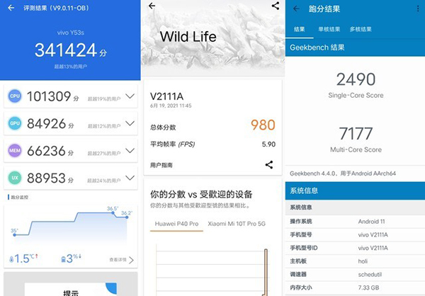 在安兔兔測試中,vivo Y53s獲得了341424分的成績;其在3DMark Wild Life測試中則獲得了980分的成績;Geekbench測試中vivo Y53s獲得了2490分的單核成績和7177分的多核成績。整體來看,vivo Y53s能夠滿足用戶日常生活中的5G流暢娛樂需求。
