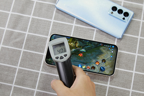 在實(shí)際上手過程中,iPhone 12在運(yùn)行高畫質(zhì)高幀率的王者榮耀一段時(shí)間后,屏幕溫度一度來到了40.8度,作為對(duì)比,OPPO Reno6 Pro+在對(duì)性能要求更高的和平精英下基本保持滿幀運(yùn)行,屏幕溫度也僅有39.4度。以往iPhone 12在運(yùn)行大型游戲一個(gè)小時(shí)后,難免會(huì)出現(xiàn)降頻、降低亮度來應(yīng)對(duì),不得不說OPPO Reno6 Pro+能擁有這么持久且良好的游戲體驗(yàn),還是讓人比較意外的。