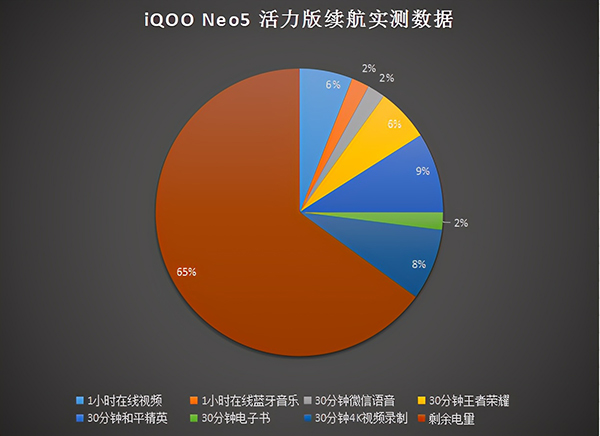 為了提升手機的續(xù)航能力,iQOO Neo5活力版搭載了44W 閃充技術(shù),并配備了高達4500mAh的大容量電池。作為一個手機重度用戶,每次手機電量不足的時候我都有種心慌的感覺,為此,我也測試了一下iQOO Neo5活力版的續(xù)航情況。在實際測試中,不管是使用這款手機玩游戲、看視頻還是聽音樂等等,手機的耗電速度都比較慢,而在連續(xù)用這款手機玩了4.5個小時后,總共也只消耗了35%的電量,即使按照每天使用手機8/9個小時來算,這款手機也能支撐用戶正常使用一整天。