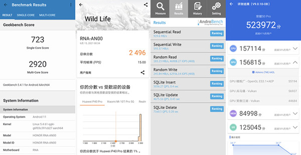 硬件層面來看,驍龍778G的規(guī)格是較為不錯的,參考幾款常用跑分軟件成績,CPU部分,榮耀50 Pro Geekbench單核得分723,多核得分2920;GPU部分,3DMark WildLife得分2496;AndroBench讀寫測試,榮耀50 Pro GB+GB版本順序讀寫分別為929.6、593.37 MB/s,隨機讀寫分別183.23、245.84 MB/s;綜合性安兔兔V9.0.10-OB,總分523972,都是比較拿得出手的。