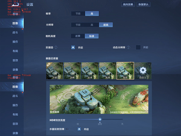 《王者榮耀》因為官方還未更新90幀模式支持,所以我們測試「極致畫質+高幀率+超高分辨率」,抗鋸齒和水面反射效果開啟,動態(tài)分辨率關閉。