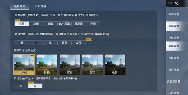 《和平精英》先選擇「超高清+極限幀率(60FPS)+抗鋸齒開+陰影開」畫質,經典海島地圖單排。