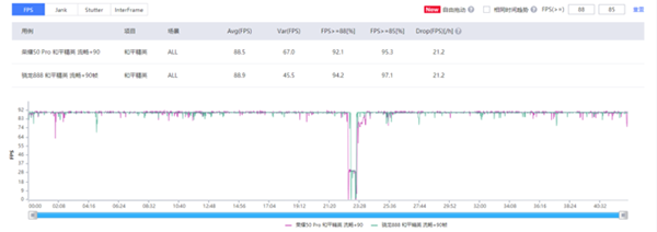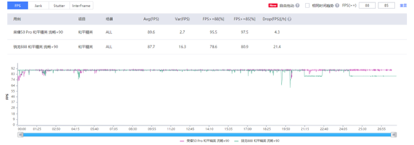 本局榮耀50 Pro平均幀率89.6FPS,波動2.7,驍龍888對比機型平均幀率87.7,波動16.3,而且能看到本局末尾階段,驍龍888機型出現了過熱降頻的問題,幀率出現了兩段下降,且后一段一直延續(xù)到游戲結束。這意味著榮耀50 Pro在長時間的連續(xù)高幀率游戲體驗中會更加穩(wěn)定,如果你喜歡玩《和平精英》,那么手握榮耀50 Pro就能放心大膽隨意開各檔畫質和幀率,流暢的表現相信都能讓你輕松上分。