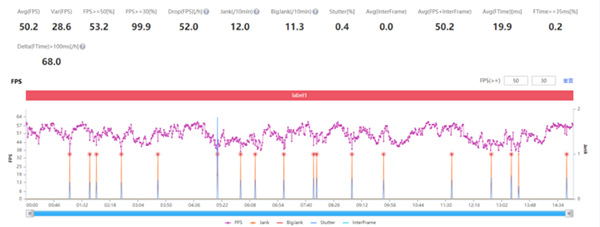 測試總時長超過1個小時,最后一局游戲幀排除異常波動單獨記錄,長時間的持續(xù)游戲對手機的散熱和綜合調度提出了更高的要求。
