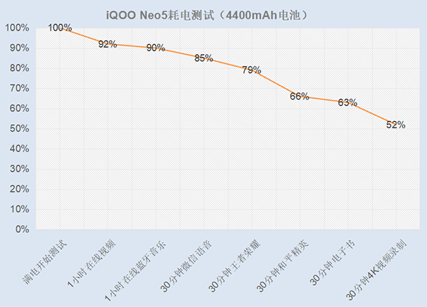 iQOO Neo5內(nèi)置的電池容量是4400mAh,這個(gè)容量不大不小,畢竟前面還有不少電池容量高達(dá)5000mAh的機(jī)型,后面跟著很多4000mAh電池容量的機(jī)型,包括電池向來小的iPhone手機(jī)。經(jīng)過4.5小時(shí)的系列耗電項(xiàng)目測試后,iQOO Neo5剩余52%電量,像在線煲劇一個(gè)小時(shí)耗電8%、玩王者游戲半小時(shí)耗電6%,確實(shí)展示出可觀的續(xù)航能力。要是按照王者榮耀耗電速度的話,那么玩家使用iQOO Neo5可以玩上起碼6個(gè)小時(shí),游戲玩到爽,這才過癮。