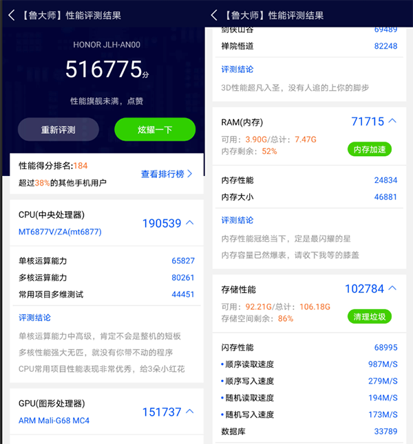 在魯大師的性能測(cè)試中,榮耀50 SE的得分達(dá)到了516775分,天璣900的性能被充分施展,相較于同配置機(jī)型絲毫不落下風(fēng)。