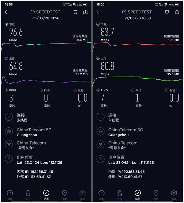 在WiFi 6網(wǎng)絡(luò)下的測試,同樣采用《SPEEDTEST》軟件進(jìn)行測試,整體的ping值延時(shí)和抖動(dòng)更是優(yōu)于現(xiàn)時(shí)信號(hào)干擾復(fù)雜的2.4G網(wǎng)絡(luò),更帶來更加穩(wěn)定、高速的無線網(wǎng)絡(luò)體驗(yàn)。