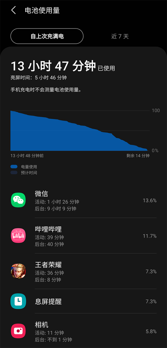 微信,每天約1.5~2個(gè)小時(shí),耗電約20%;Bilibili,每天約0.5個(gè)小時(shí),耗電約11%;