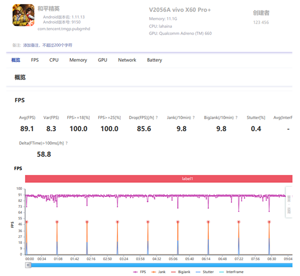 驍龍888+120Hz 高刷屏的組合,在游戲場(chǎng)景下能夠獲得更好的體驗(yàn),尤其是支持高幀率模式的游戲。我比較意外的是,vivo X60 Pro+這款手機(jī)的高幀模式游戲兼容性,王者榮耀、和平精英等熱門(mén)游戲,均適配了90幀模式。如下圖所示,在王者榮耀中,vivo X60 Pro+實(shí)現(xiàn)了89.9FPS的滿(mǎn)幀率運(yùn)行,已然達(dá)到了滿(mǎn)幀率運(yùn)行的范疇。