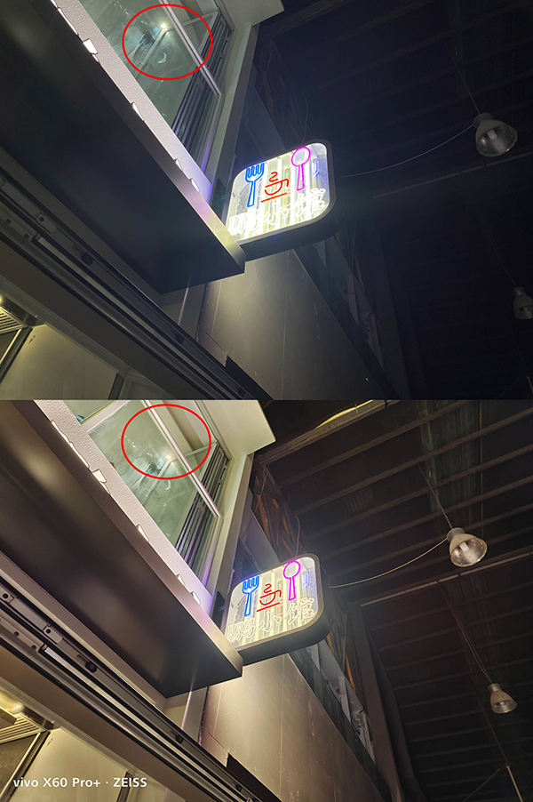 得益于全系蔡司光學鏡頭的優(yōu)勢,vivo X60 Pro+在抗眩光、鬼影等光學問題方面,也有了更好的表現(xiàn)。從下面的樣張來看,沒有蔡司光學鏡頭的手機在夜間拍照時出現(xiàn)了較為明顯的鬼影,而vivo X60 Pro+盡管也有鬼影現(xiàn)象,但并不明顯,成像效果也更好。