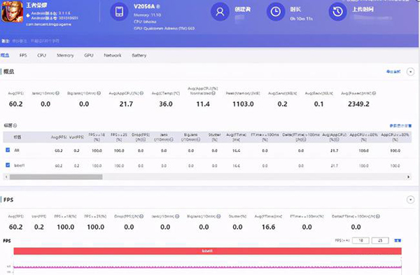 考慮到游戲是一項(xiàng)更可以考驗(yàn)機(jī)身性能的操作,我們重點(diǎn)進(jìn)行了王者榮耀、和平精英兩項(xiàng)游戲的測(cè)試,數(shù)據(jù)顯示,王者榮耀中,它能得到60.2FPS的成績(jī),已經(jīng)超過(guò)了系統(tǒng)設(shè)定的60幀,從最下方的幀率曲線也看到它的走勢(shì)是極為平緩的,這說(shuō)明了搭載有驍龍888等專業(yè)硬件的vivo X60 Pro+已有足夠的性能來(lái)應(yīng)對(duì)這游戲。