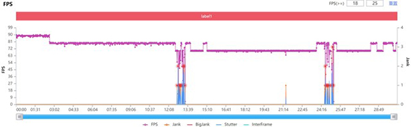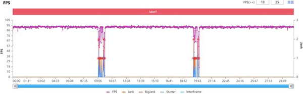 需要注意的是,大家會在接下來每臺手機的幀數(shù)曲線中看到兩處觸底,那里是一局結(jié)束、進入非游戲界面開啟第二局的畫面幀數(shù),并不是游戲畫面的卡頓。