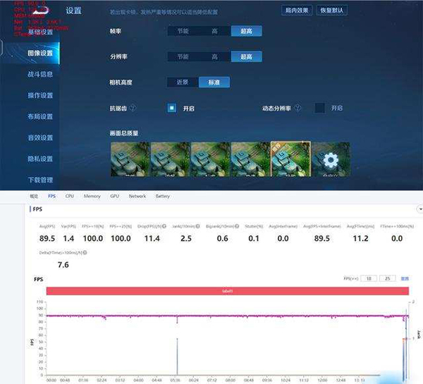 在《王者榮耀》實(shí)際體驗(yàn)環(huán)節(jié)可以看到,即便是在開啟超高幀率、超高分辨率等各色頂尖配置后,iQOO 7在整局王者榮耀體驗(yàn)中一直能夠保持非常平穩(wěn)的幀率水準(zhǔn),平均FPS達(dá)到了89.5幀,幾乎接近滿幀狀態(tài),而且在游戲過程中,畫面一直十分流暢,并沒有出現(xiàn)卡頓等現(xiàn)象。