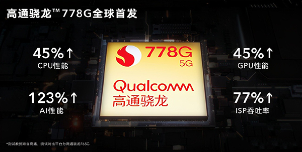 其次自然是驍龍778G的功勞,除了臺(tái)積電6nm制程,Kryo 670架構(gòu)主頻2.4GHz的Cortex-A78以及Adreno 642L GPU等核心參數(shù)外,還集成了驍龍X53 5G調(diào)制解調(diào)器,峰值下載速度為3.3Gbps,支持所有關(guān)鍵頻段,包括TDD和FDD頻率的mmWave和Sub-6,NSA和SA模式以及動(dòng)態(tài)頻譜共享(DSS),同時(shí)還集成FastConnect 6700無(wú)線(xiàn)模組,支持最新WiFi6E技術(shù)等。