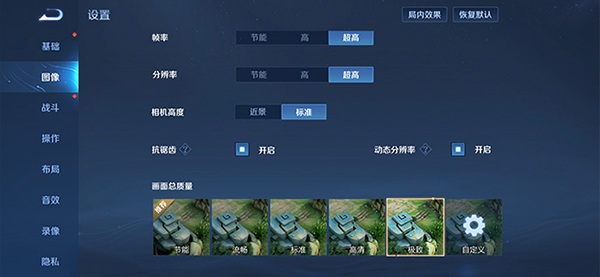 王者榮耀更新之后,在設(shè)置-圖像菜單中,幀率的選項(xiàng)新增“超高”選擇,對(duì)應(yīng)的是90幀高幀率模式。為了進(jìn)一步考驗(yàn)榮耀50的性能,測(cè)試時(shí)我們同步啟用了超高分辨率,并選擇極致畫質(zhì)。