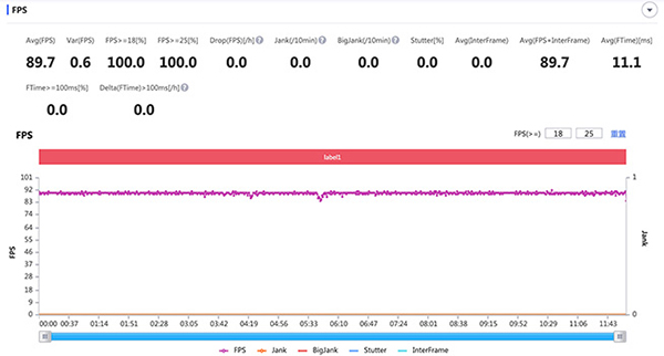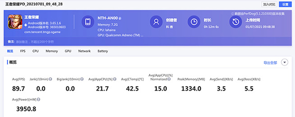 接下來進(jìn)入5V5王者峽谷匹配賽,在游戲?qū)Q全程,榮耀50流暢無卡頓,機(jī)身發(fā)熱不明顯,觸控跟手靈敏度令人滿意。根據(jù)PerfDog監(jiān)測(cè)的數(shù)據(jù),榮耀50在近12分鐘的游戲中,平均幀率高達(dá)89.7FPS,表明確實(shí)能夠持續(xù)高幀率運(yùn)行,而CPU平均溫度42.5℃,說明溫度控制也表現(xiàn)不俗。