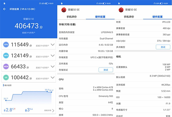 很多人最關(guān)心的,當然就是手機的性能。沒錯,手機的性能,目前來說非常重要。盡管很多頂級的旗艦,都是性能過剩,但是為了流暢地運行各種大型APP和游戲,性能依然需要保障。眾所周知,榮耀50 SE采用的是天璣900處理器,配置了8G RAM+128G ROM。這款天璣900處理器,采用的是6nm工藝,從制程方面來說目前屬于第一梯隊;2個A78大核,6個A55小核,最高主頻2.4GHz;采用的是UFS 2.X。