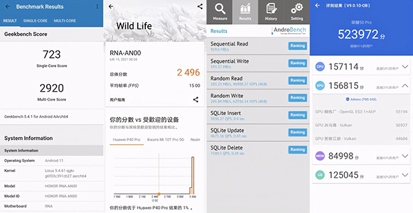 驍龍778G安兔兔跑分為52萬+,Geekbench單核得分723,多核得分2920;GPU部分,3DMark WildLife得分2496;AndroBench讀寫測(cè)試,榮耀50 Pro 8GB+256GB版本順序讀寫分別為929.6、593.37 MB/s,隨機(jī)讀寫分別183.23、245.84 MB/s。