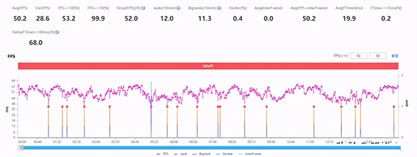 最終,榮耀50 Pro平均幀率維持在50.2FPS,同時(shí)波動(dòng)間的最低幀率控制也較好,最低幀基本也維持在30FPS以上,實(shí)際游戲體驗(yàn)還是比較流暢的,沒有明顯的掉幀與卡頓現(xiàn)象。