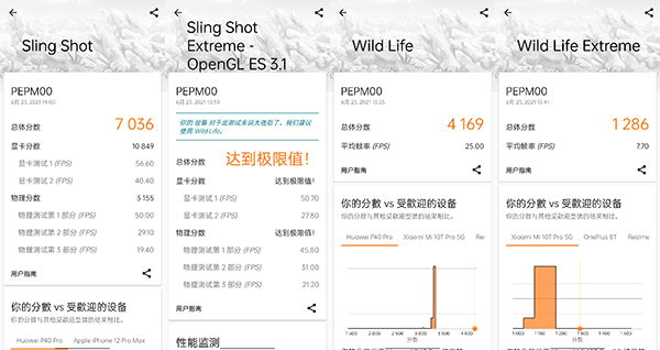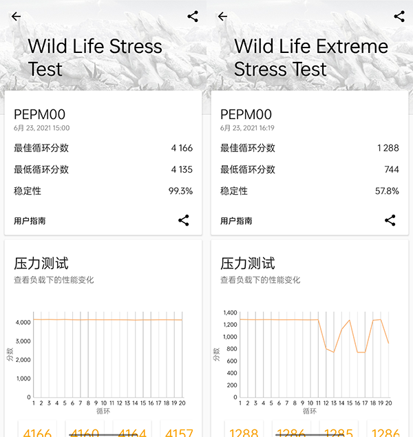 此外,在Wild Life Stress Test壓力測試的項(xiàng)目上,OPPO Reno6 Pro連續(xù)20次高強(qiáng)度負(fù)載穩(wěn)定性的測試得分為99.3%,表現(xiàn)平穩(wěn)。而在Wild Life Extreme Stress Test壓力測試中,作為一款輕薄型旗艦機(jī)型,考慮到散熱、續(xù)航等原因,OPPO Reno6 Pro的表現(xiàn)較為保守,同時(shí)作為一款非游戲手機(jī),能在Wild Life Stress Test得出99.3%的穩(wěn)定性已然非??煽?,并不需要再去糾結(jié)專為游戲手機(jī)用以壓榨性能極限的壓力測試。