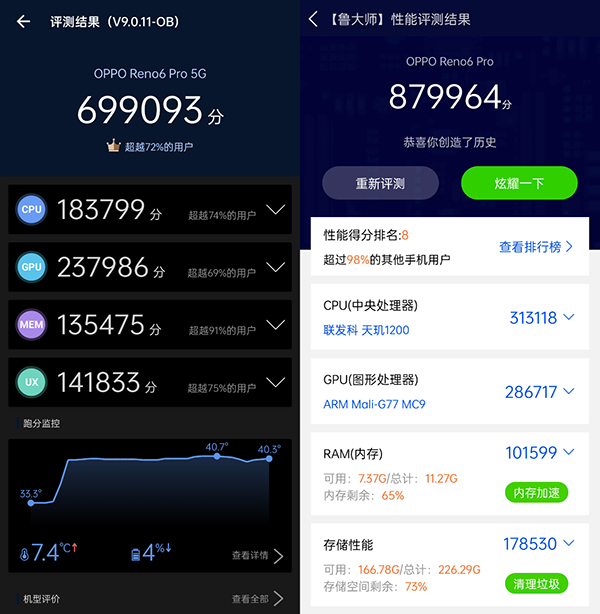 從GeekBench4和GeekBench4的理論成績來看,OPPO Reno6 Pro所搭載的這款天璣1200與驍龍870主流機(jī)型的成績幾乎持平。單核性能驍龍870略強(qiáng),多核性能則是天璣1200略強(qiáng),所以O(shè)PPO Reno6 Pro的性能至少是達(dá)到了旗艦級水準(zhǔn),用戶完全可以放心使用。