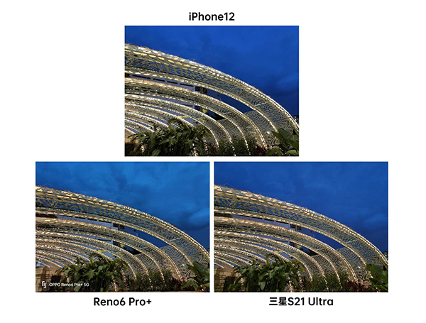 最后是兩組光線充足的場景對(duì)比,能夠明顯看到iPhone 12依然是畫面趨向真實(shí),但是這樣帶來的結(jié)果是整體亮度出現(xiàn)過曝問題,畫面略顯泛白;盡管S21 Ultra和OPPO Reno6 Pro+在硬件方面存在一定差異,但是在這組對(duì)比中他們的表現(xiàn)都差不多,S21 Ultra的優(yōu)勢(shì)在于解析力更好,畫質(zhì)更好一些,但是曝光把控略顯不足。OPPO Reno6 Pro+則是在AI超清夜景算法幫助下,成功壓制住高光,明暗部細(xì)節(jié)更精準(zhǔn)自然,觀感更舒適,這也是非常重要的。