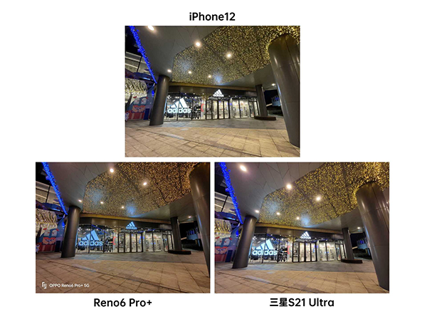 首先是前兩組的樣張,在比較考驗(yàn)的夜景實(shí)拍中,三臺(tái)手機(jī)的整體畫面都比較出色,在噪點(diǎn)上的控制都非常到位,畫面亮度都有一定程度的提升。但從視覺效果來看,畢竟是有著大底傳感器的加持,三星S21 Ultra、OPPO Reno6 Pro+的畫面亮度確實(shí)更高一些,通透的色彩更加討喜,整張照片給人的色調(diào)風(fēng)格很不錯(cuò)。雖說iPhone 12畫面略微暗淡,暗部細(xì)節(jié)呈現(xiàn)略顯不足,但是總體而言還算不錯(cuò),和前兩者差距不大。