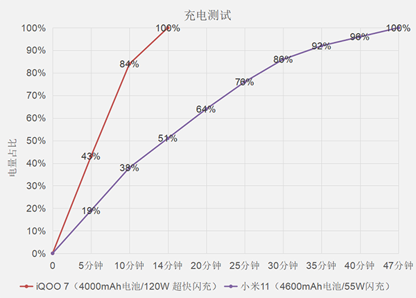 換個(gè)角度看,對(duì)于手機(jī)續(xù)航,或者說(shuō)所謂的續(xù)航焦慮癥,更多還是表現(xiàn)在手機(jī)低電量或沒(méi)電時(shí)的回血能力。給你看看小米11與iQOO 7的充電數(shù)據(jù):前者用了47分鐘充電100%,后者用了14分鐘就完成充電工作,彼此充電時(shí)間差距太大了,起碼相差30分鐘以上。