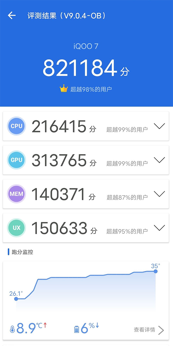 強悍的硬件性能是出色游戲體驗的關(guān)鍵基礎(chǔ),為了給用戶帶來行業(yè)內(nèi)最強的硬件性能,iQOO 7不僅配備了5nm制程工藝的高通驍龍888處理芯片,同時還搭載了增強版LPDDR5運存以及增強版UFS 3.1超快閃存,無論是數(shù)據(jù)處理速度、數(shù)據(jù)讀寫速度還是多任務(wù)體驗都極為優(yōu)秀。此外iQOO 7還配備了Multi-Turbo 5.0優(yōu)化技術(shù)以及可以讓運存“加3G”的內(nèi)存融合技術(shù),進一步讓硬件性能得到了更為極致的發(fā)揮,確保日常用機體驗以及游戲體驗都十分的流暢。在安兔兔綜合性能測試中,iQOO 7的得分超過了82萬分。