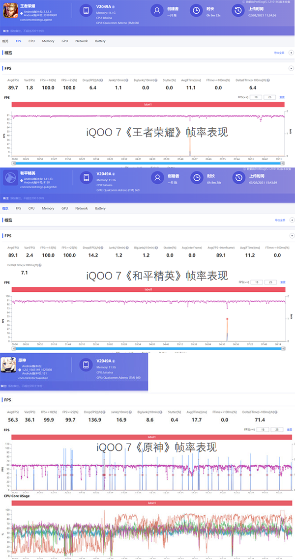 那么iQOO 7的實際游戲體驗表現(xiàn)如何呢?在《王者榮耀》、《和平精英》以及《原神》三款熱門游戲的幀率測試中,iQOO 7分別實現(xiàn)了平均幀率89.7幀、89.1幀以及56.3幀的好成績,并且?guī)是€都比較穩(wěn)定,就算是在《原神》中也沒有出現(xiàn)大范圍幀率波動的情況,這在當(dāng)前的智能手機市場中已經(jīng)屬于頂尖水準(zhǔn)。