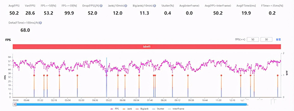最終,榮耀50 Pro平均幀率維持在50.2FPS,同時波動間的最低幀率控制也較好,最低幀基本也維持在30FPS以上,實際游戲體驗還是比較流暢的,沒有明顯的掉幀與卡頓現(xiàn)象。