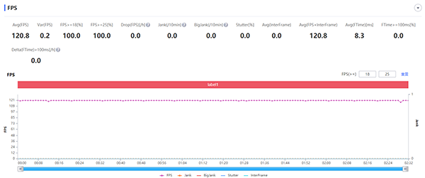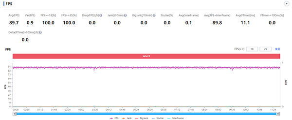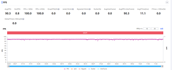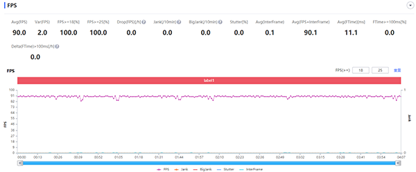 第一款游戲是《王者榮耀》,開啟超高幀率、超高分辨率,抗鋸齒和動(dòng)態(tài)分辨率也全部打開,畫面總質(zhì)量都調(diào)為最高,實(shí)測(cè)它的平均幀數(shù)為90.3幀,通過(guò)幀數(shù)曲線圖來(lái)看得話,紅魔游戲手機(jī)6 Pro的表現(xiàn)可以說(shuō)非常穩(wěn),幀率波動(dòng)的幅度非常小,看來(lái)游戲手機(jī)玩游戲果然有優(yōu)勢(shì)。