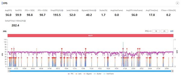 我們先來(lái)看一下它的幀率曲線圖,它的平均幀率為56幀,全程都沒(méi)有出現(xiàn)鎖頻現(xiàn)象,能得到56幀的平均幀率還是很不錯(cuò)的,我們目前的最好成績(jī)是黑鯊4 Pro的57.7幀。