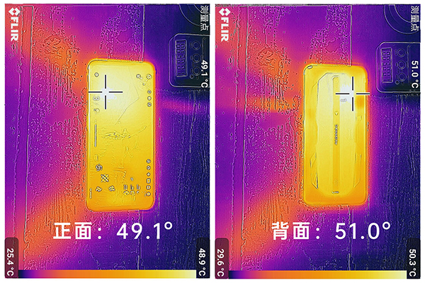 在游戲結(jié)束后,我們立即對(duì)它進(jìn)行了發(fā)熱測(cè)試,實(shí)測(cè)它正面的最高溫度為49.1°,背面的最高溫度為51.0°,相比之下還是有點(diǎn)燙的。