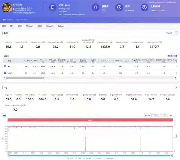 下圖是使用iQOO Neo5活力版運(yùn)行《和平精英》時(shí)給出的幀數(shù)數(shù)據(jù)圖,平均幀數(shù)達(dá)到59.8幀,即使是全程使用高畫質(zhì)下進(jìn)行游戲,期間也沒有出現(xiàn)任何掉幀、卡頓現(xiàn)象,可以說是非常穩(wěn)定。