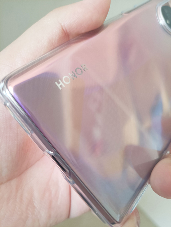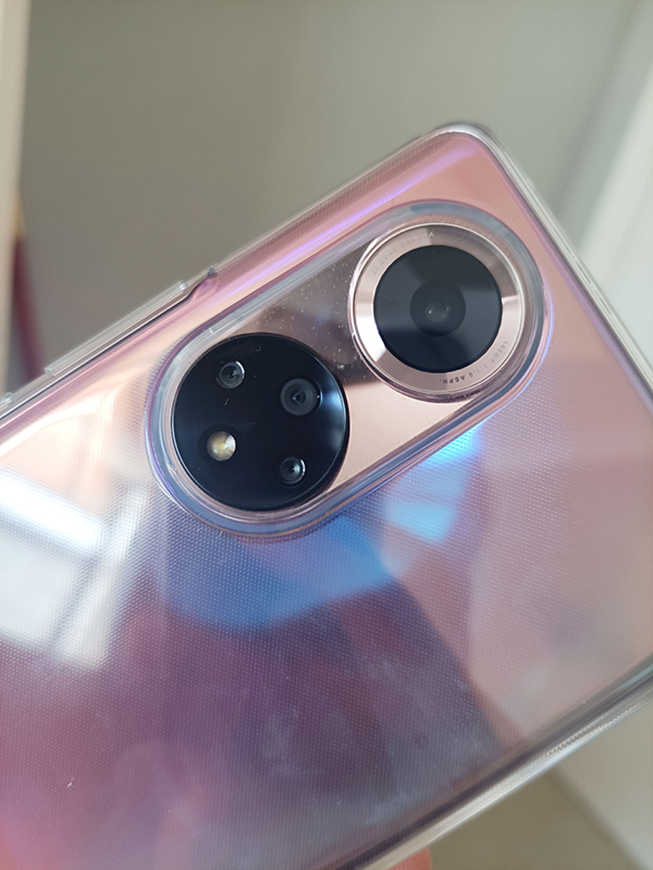 在機(jī)身背面,榮耀50 Pro更有辨識(shí)度,兩個(gè)圓形大環(huán),上面是主攝,下面是三個(gè)攝像頭和閃光燈,這樣的設(shè)計(jì)很亮眼,第一眼就惹人關(guān)注。我手上這臺(tái)是夏日琥珀,介于紅色和粉色之間,機(jī)身背面在光線的變化下,也可以實(shí)現(xiàn)變化,很是好看。