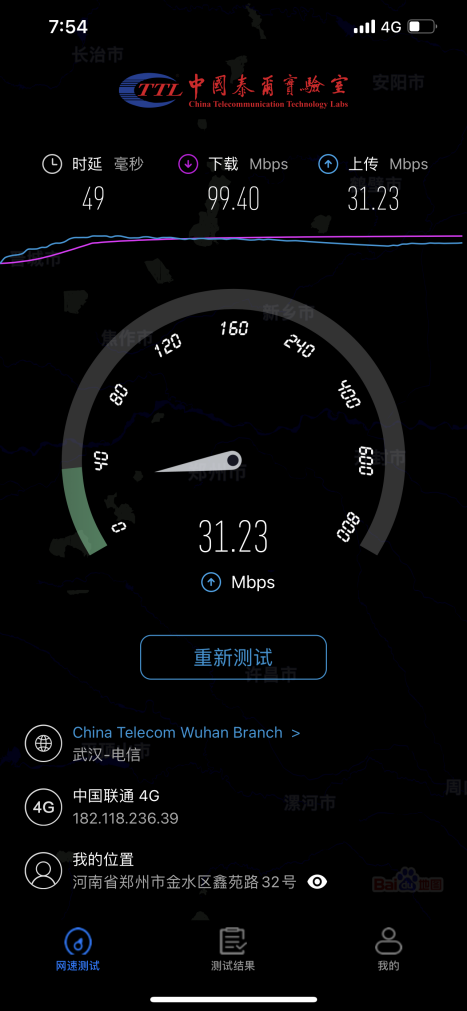 在經(jīng)過(guò)測(cè)試后可以看到,iPhone 12僅能接收到4G信號(hào),下載速率為99.4Mbps,峰值下載速率為124.09Mbps,上傳速率達(dá)到31.23Mbps,延遲為49毫秒。