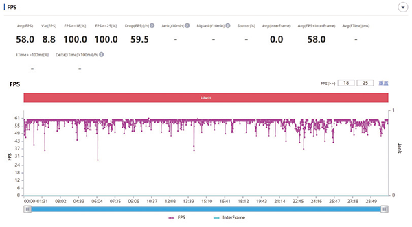 面對(duì)夜晚時(shí)分璃月港場(chǎng)景的《原神》,中興Axon30 Ultra在半小時(shí)測(cè)試中的平均幀率達(dá)到58fps,幀率方差僅為8.8fps。
